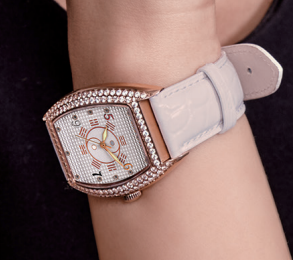瑞士石英机芯、316L精钢镀18K玫瑰金表壳、蓝宝石表镜、鳄鱼皮表带、水晶